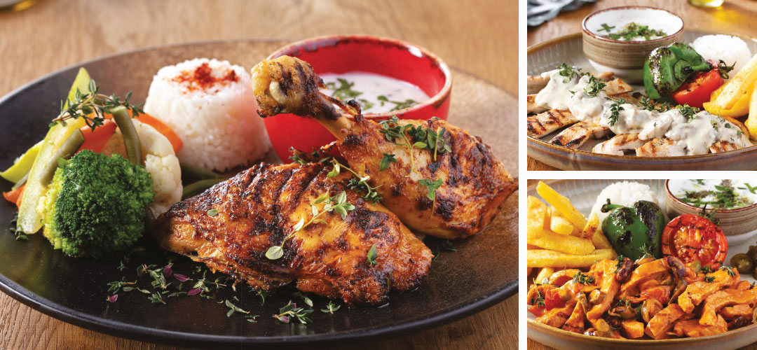 Tavuklar Tatlı-Ekşi Soslu Tavuk Çıtır Kızarmış Enfes Tavuklar, Tatlı Ekşi Sos, Patates Kızartması, Sebzeli Noodle ve Soğan Halkası Chicken Fingers Özel Karışım Kajun Baharatıyla Karıştırılmış Tavuk Filetoları, Patates Kızartması, Soğan Halkaları, Coleslaw Salata, Salsa Sos Eşliğinde Mexican Chicken Jalapeno, Meksika Fasulyesi ve Sebzelerle Sotelenmiş Tavuk Parçaları Tavuk Schnitzel Özel Karışımla Kızartılmış Tavuk, Patates Kızartması, Soğan Halkaları, Coleslaw Salata ve Baharatlı Tereyağı Köri Soslu Tavuk Tavuk, Köri Sosu, Karışık Sebze, Kırmızı Biber, Pilav, Cacık, Patates Kızartması, Akdeniz Yeşilliği Mantar Soslu Tavuk Nefis Mantar Soslu Tavuk, Tereyağlı Pilav, Patates Kızartması, Cacık, Domates ve Biber Izgara Tikka Soslu Tavuk Tavuk But, Tortilla Ekmeği, Tıkka Sos, Erişte, Domates, Biber Izgara, Patates Kızartma Peri Peri Tavuk But Sekiz Çeşit Otla Tatlandırılmış Tavuk But Parçaları, Pilav, Karışık Sebze, Cacık Mantar Soslu Schnitzel Özel Karışımla Kızartılmış Tavuk, Pilav ve Patates Kızartması ile Domates Biber Izgara Chicken Katsu Kızarmış Panelenmiş Tavuk, Köri Sos, Karışık Sebze ve Pilav Extra But